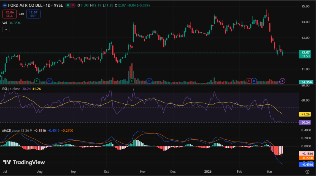 F stock closed at $12.06 using last market data on March 12, 2026. It edged up 0.2% that day between $12.03 low and $12.10 high. Five-day trend holds steady around $12.19 from early March. One-month gains reached 15% from February dips near $10.50.