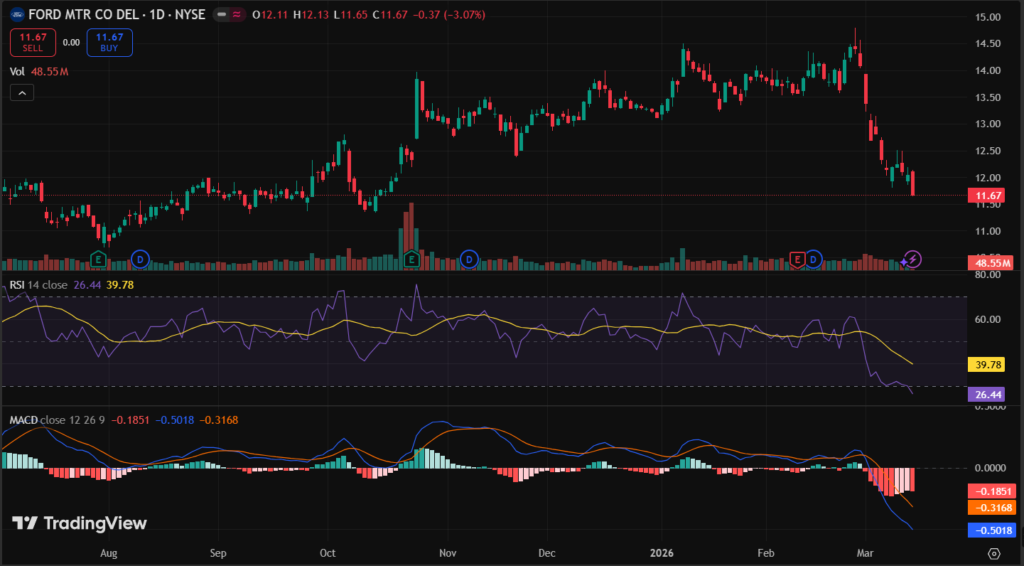F stock closed at $11.67 last market session using Yahoo Finance data. It dipped 0.37 or 3% in one day on trade fears. Five-day trend fell 2.5%, one-month down 5%.