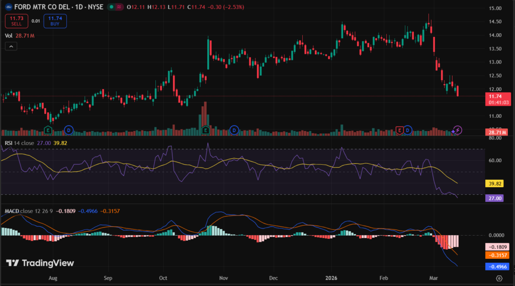 Volume average 50 million, steady without spikes. F technical analysis guides beginners to watch $12 floor for direction clues.