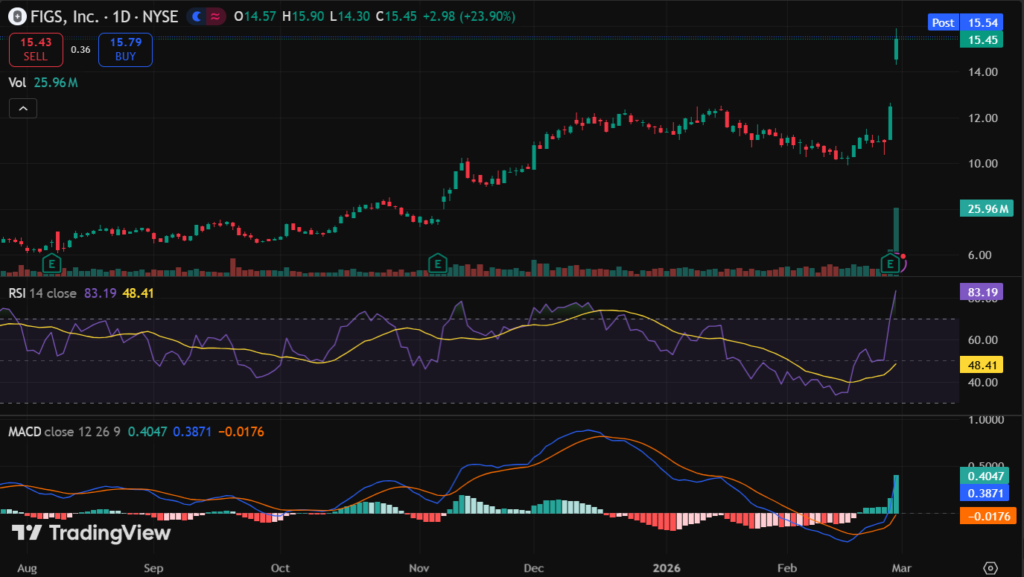 FIGS stock closed at $15.27 on February 27, 2026, after surging 18.1% that day on blowout Q4 results.