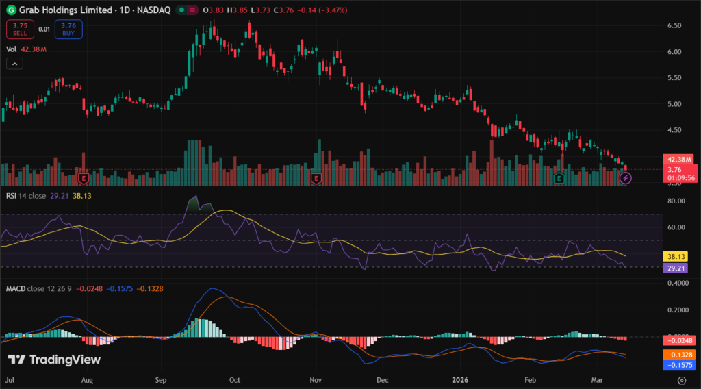 GRAB stock closed at $4.14 using last market data as of early March 2026. It dipped 0.13% from $3.96 prior close on March 9. Five-day trend shows mild pullback from $4.49 highs, stabilizing around $4.20. One-month view reflects 4% gains amid volatility.