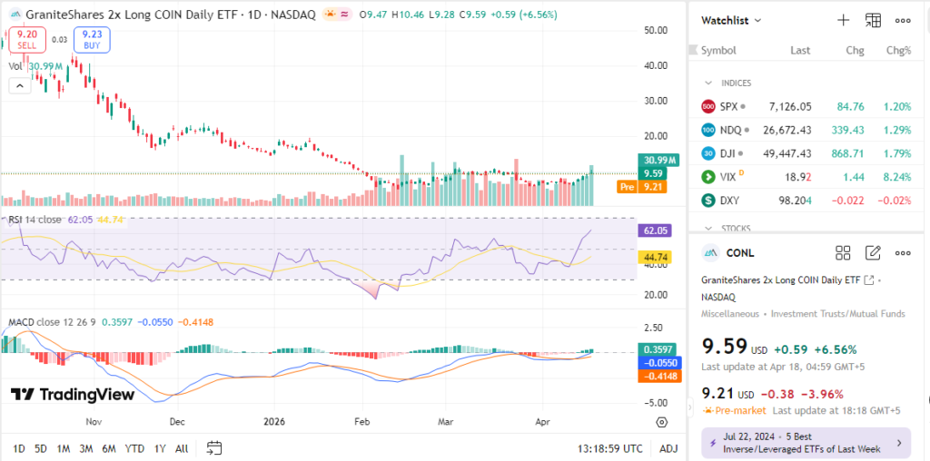 As of the last market close on April 20, 2026, the GraniteShares 2x Long COIN Daily CONL ETF price sat around 9.54 USD per share. Over the past 1 day, CONL posted gains of about 5–6%, reflecting a strong intraday move higher within a range roughly between 9.28 and 10.46 USD