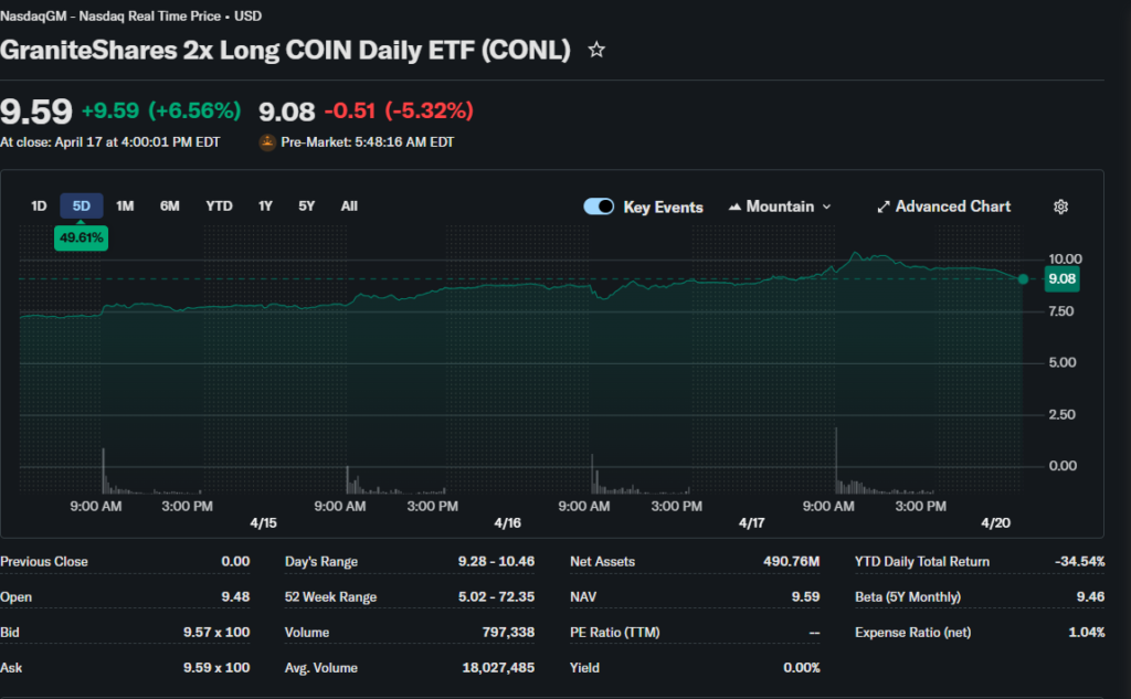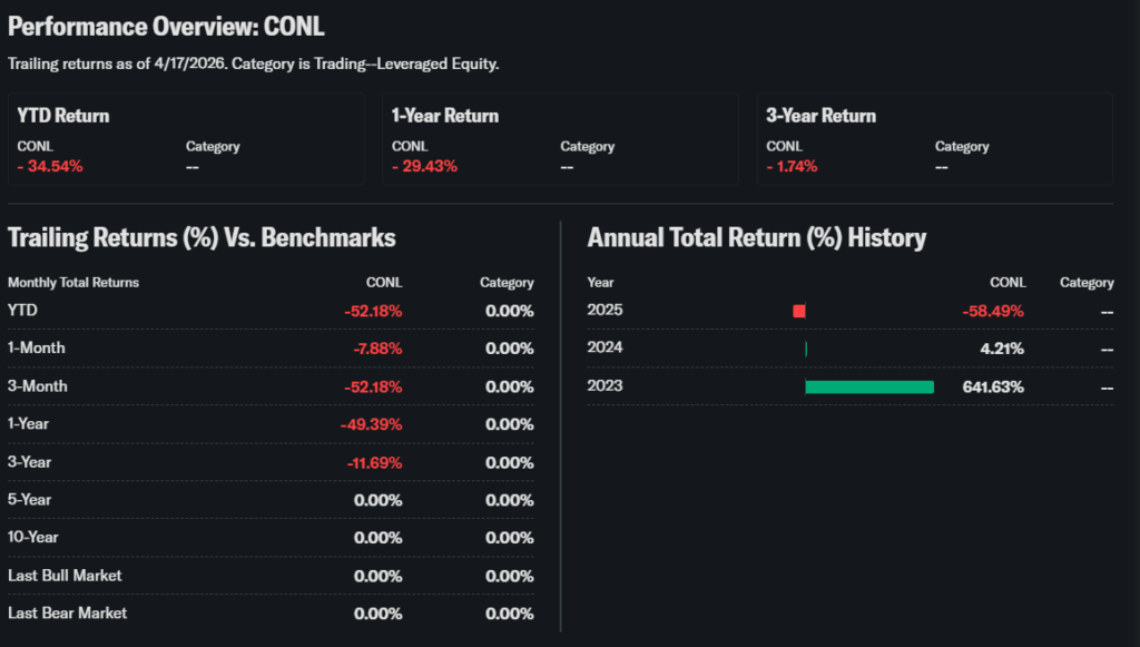 Over 5 trading days, CONL has shown a modestly positive trend, benefiting from a rebound in Coinbase shares and broad‑market relief in risk‑on assets. The 1‑month performance is mixed but still up slightly, as the ETF retraced some of its earlier losses tied to crypto‑price weakness earlier in 2026.