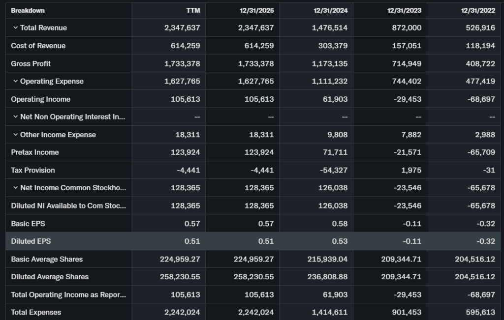 Trailing P/E stands at 60.36 on 2025 earnings. Forward P/E lower at estimated 40x on growth. Price-to-Sales around 3.7x with $2.35B 2025 revenue. Revenue grew 59% YoY, EPS up sharply to positive $0.88 TTM.