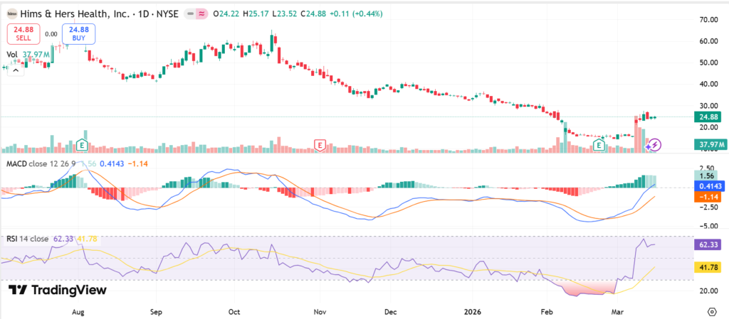 One-month trend pushed higher on partnership news, gaining from early February levels around $27. Three-month trend mixed with legal fears earlier, but rebounded strongly. Six-month trend bullish amid revenue jumps, up from sub-$20 levels. Year-to-date in 2026, HIMS stock rose over 20% despite pullbacks.