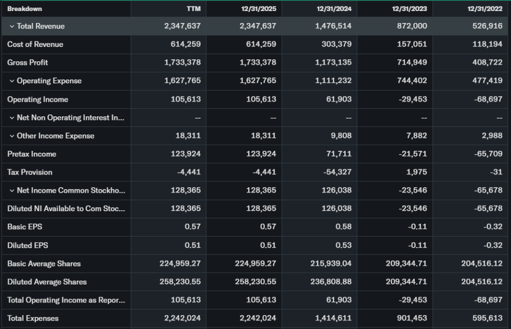Trailing P/E ratio stands at 29.26, forward P/E at 25. Price-to-sales is 4.2 based on $2.35B 2025 revenue. YoY revenue growth hit 59%, EPS growth surged 80% to support net income of $128M.