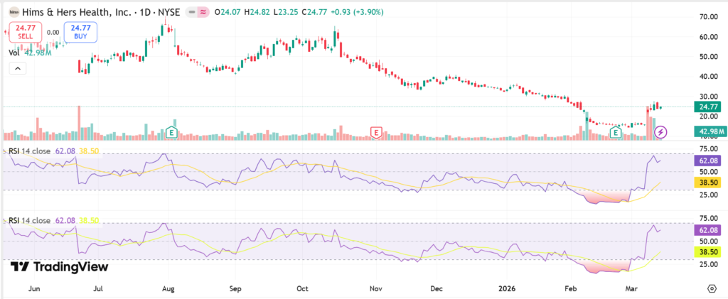 HIMS RSI analysis shows a reading of 62, neutral territory—not overbought above 70 or oversold below 30. RSI measures momentum; this suggests room for gains without immediate reversal risk.