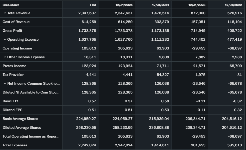 Revenue FY $1.48B with net income $126M demonstrates profitability inflection. Price-to-sales ~7x premium justified by subscriber momentum.