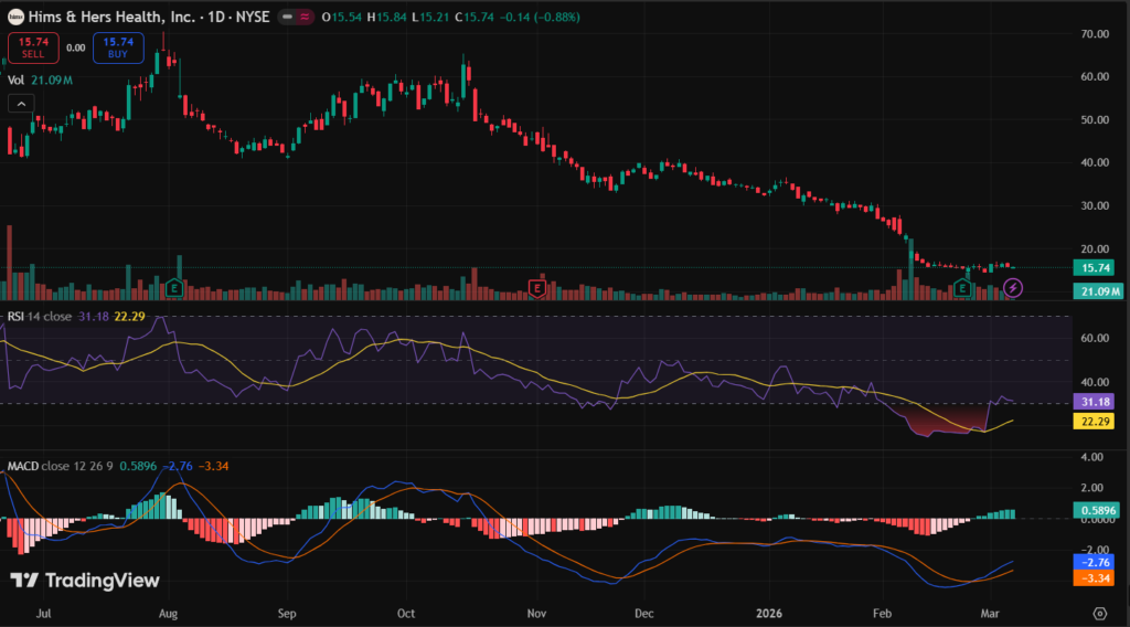 HIMS stock closed at $15.74 on March 6, 2026 (last market close data), down 0.88% from $15.88 prior day on 14.4 million shares volume. Day range $15.21-$15.84 showed tight consolidation.