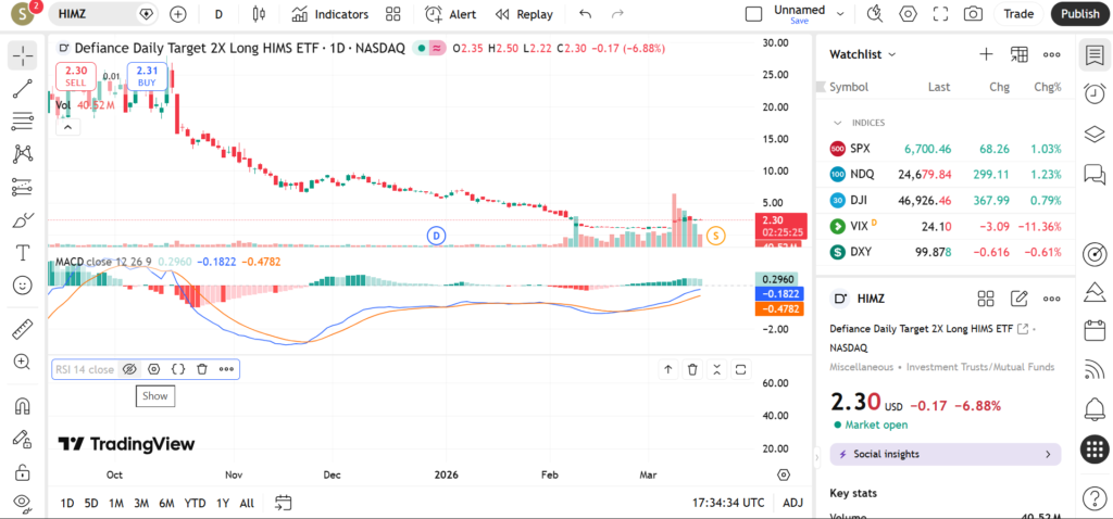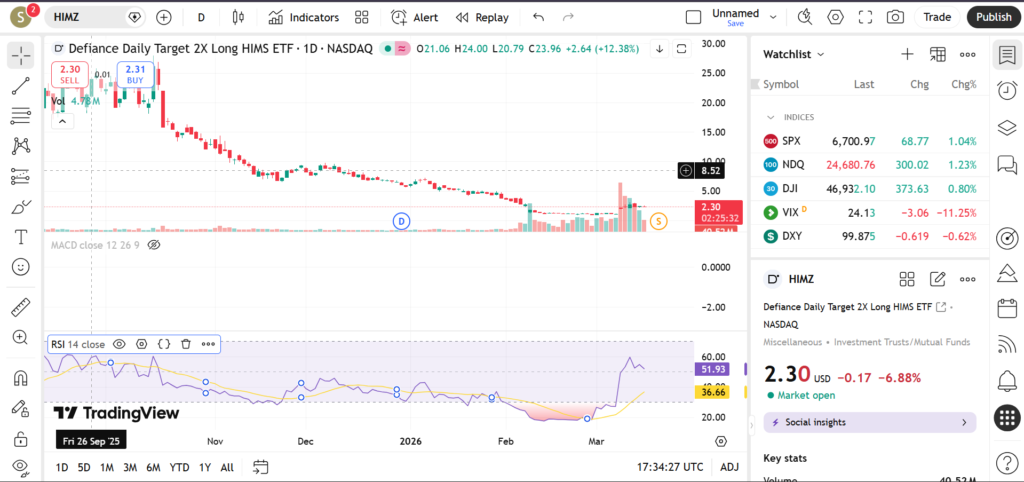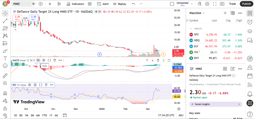 In March 2026, HIMZ is gaining interest as the healthcare and telemedicine sectors continue to evolve. Market sentiment toward growth stocks, along with company-specific developments, plays a major role in the ETF’s performance. Leveraged ETFs like HIMZ can experience sharp price movements, making technical analysis essential for understanding potential trading scenarios. This article examines HIMZ’s trend, key levels, and indicator signals.