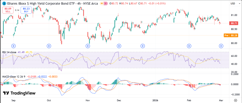 Six-month trend rose slightly 0.09%. Year-to-date, HYG ETF gained 2.64% from $78.42 base. The 52-week range spans $75.08 low to $81.36 high. Overall trend leans sideways to mildly bullish, with gains above key lows. This suggests stability for income seekers but caution on credit spreads.