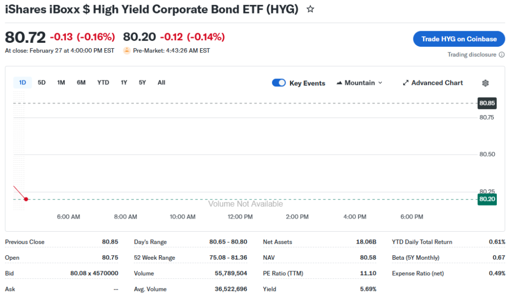 HYG ETF closed at $80.49 last market session. It fell 0.51% over the past day amid bond market volatility. The 5-day trend shows a 0.51% drop from $80.85, signaling short-term pressure. In one month, HYG ETF price dipped 0.33% to $80.81 peak. Three-month performance declined 0.57% from $81.33 high.