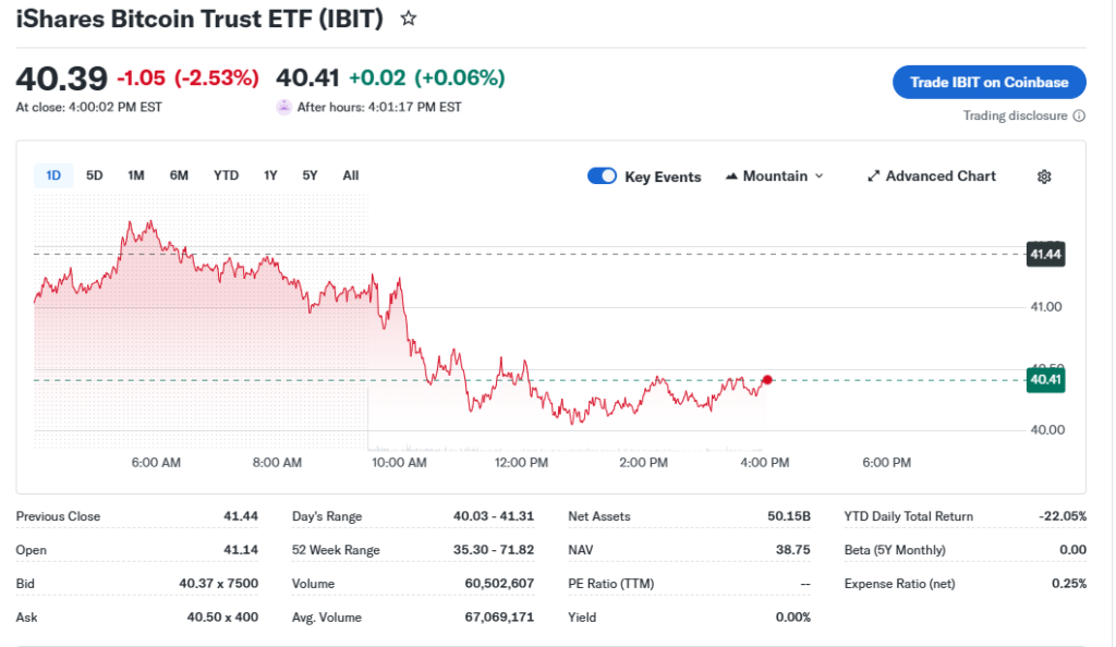 The IBIT ETF tracks Bitcoin’s spot price. It offers investors easy exposure to cryptocurrency without direct ownership. Investors watch IBIT ETF closely now due to Bitcoin’s sharp drop from 2025 highs. Broader market caution and risk-off sentiment hit crypto hard this year.
