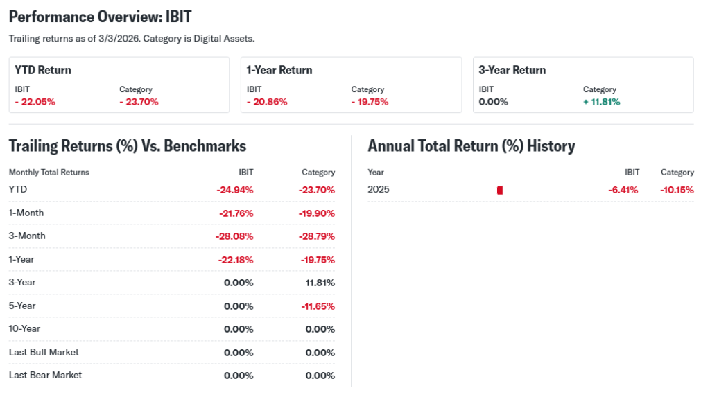 IBIT ETF closed at $41.44 on March 4, 2026, per last market data. It fell 6.41% year-to-date and 18.89% over three months. The one-month trend shows a 23.62% decline, while six-month performance dropped 18.77%.