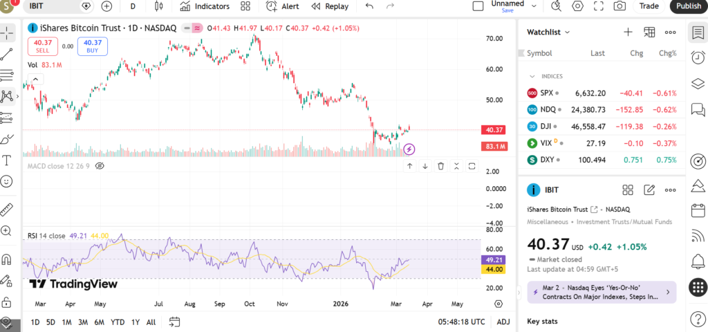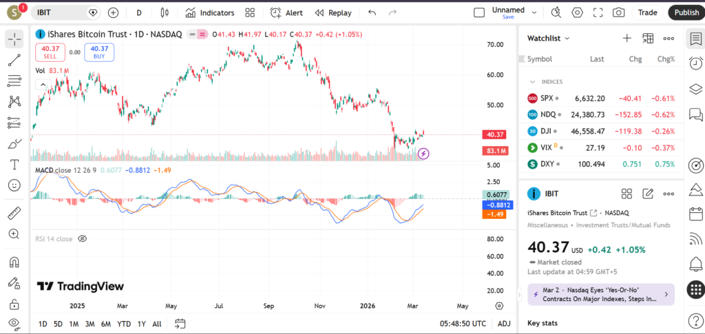 The iShares Bitcoin Trust ETF (IBIT) offers retail traders direct exposure to Bitcoin’s spot price without needing to hold cryptocurrency directly. Launched by BlackRock, it tracks Bitcoin’s performance and belongs to the digital asset sector, which has gained massive traction amid institutional adoption and regulatory shifts under President Trump’s administration. Traders are watching IBIT closely in March 2026 due to Bitcoin’s volatility around key halvings, ETF inflows, and macro events like potential Fed rate cuts; this article covers its trend, support/resistance levels, key indicators, and short-term outlook.