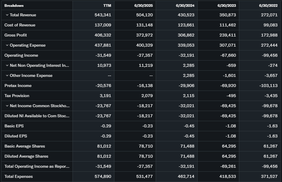 P/E negative at -89.52 reflects growth phase investments. Forward metrics attractive for SaaS at 8x sales. Revenue growth strong double-digits YoY.