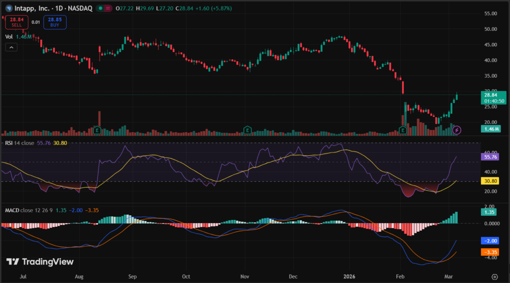 INTA stock closed at $27.24 on March 4, 2026, last market data confirmed. It rose 6.39% that day from $26.25, hitting high of $27.79. Five-day trend up sharply 21.82% from recent lows.