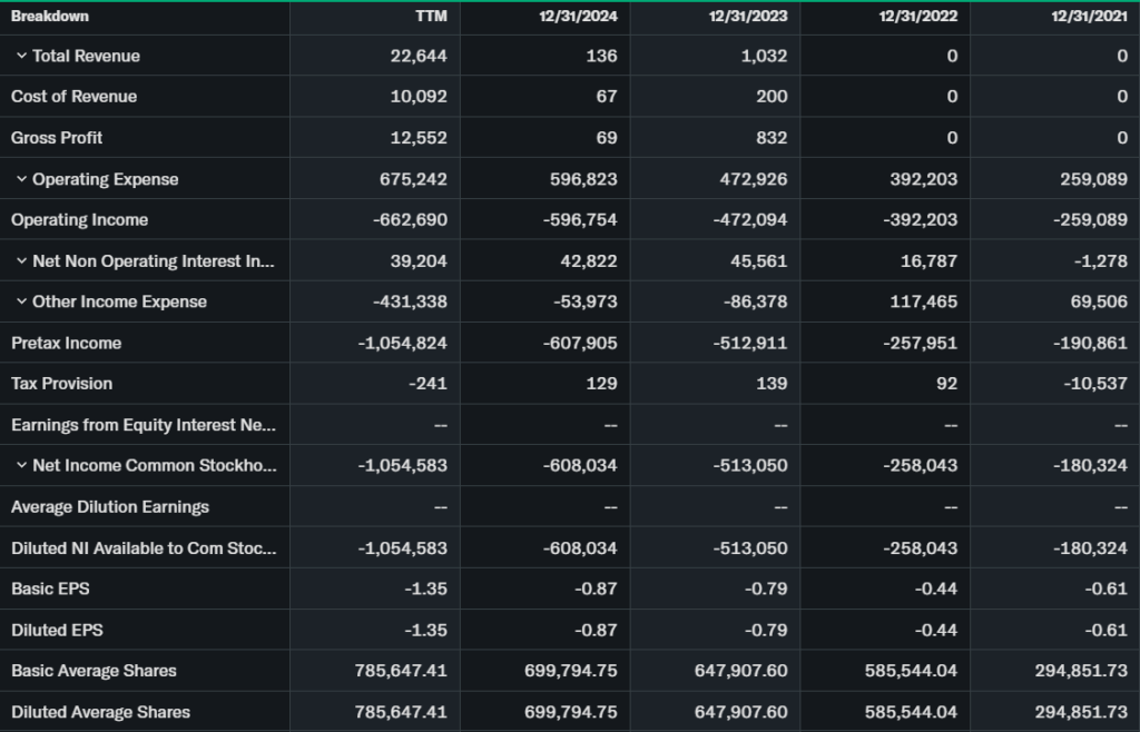 2025 revenue hit $53.43 million, up massively YoY from $136,000. EPS was -1.13; net loss $929.84 million. Free cash flow negative; cash at $1.4 billion post-raise. Debt low.
