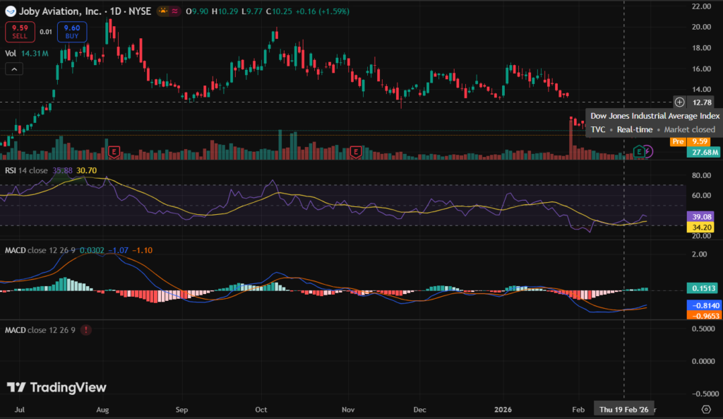 JOBY stock closed at $10.01 on March 1, 2026. It ranged from $9.81 to $10.32 that day, down from prior close of $10.23. Volume hit 27.68 million shares, above average of 23.72 million.