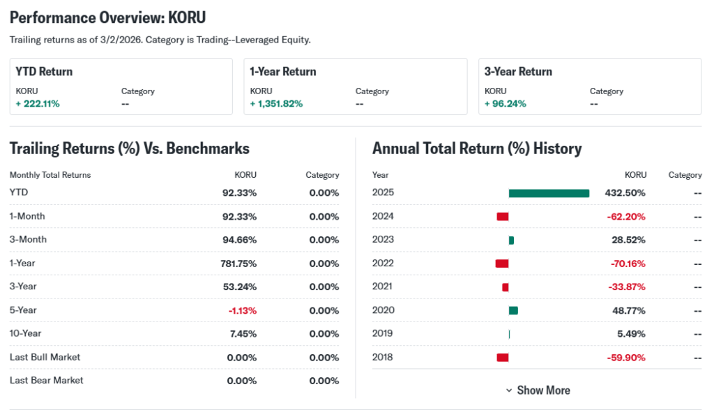 As of last market close on March 2, 2026, KORU ETF trades at $326.06, down sharply from $584.99 prior close. One-day performance plunged over 44%, reflecting profit-taking after February’s 96.47% surge.