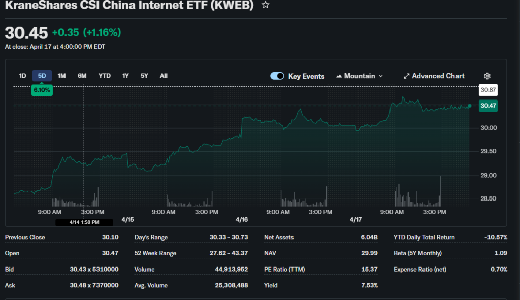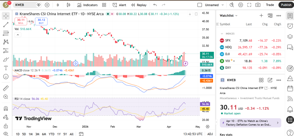As of the latest market close, the KWEB ETF price is approximately $29.80. The ETF declined slightly by around -0.6% in the last session.