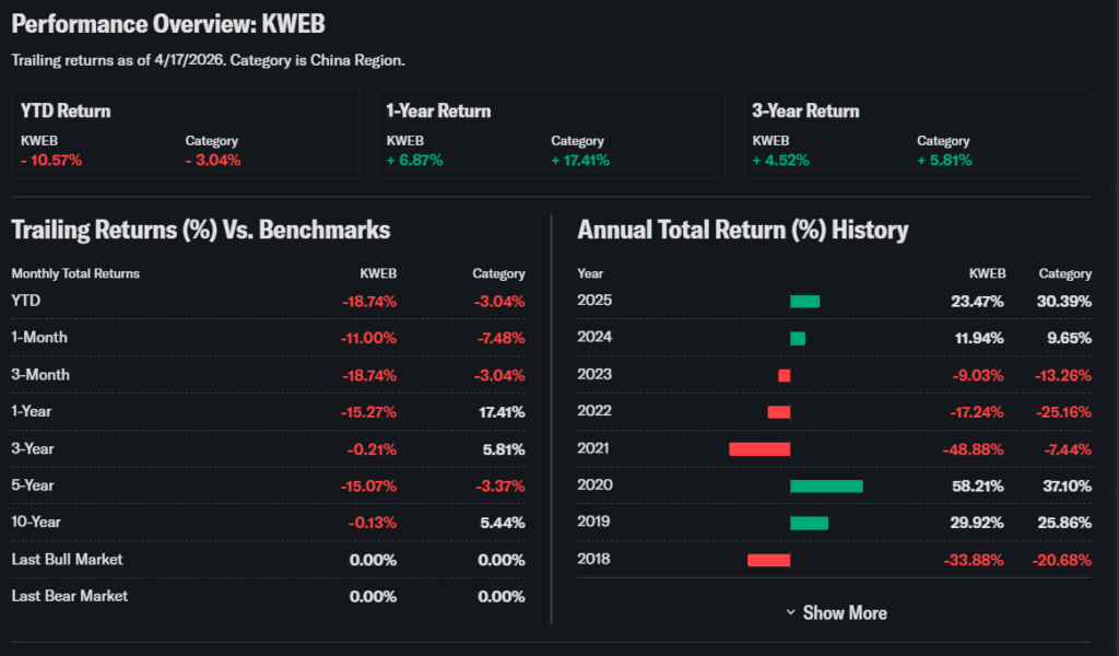 Global market sentiment toward China and geopolitical factors also play a major role in KWEB ETF performance.