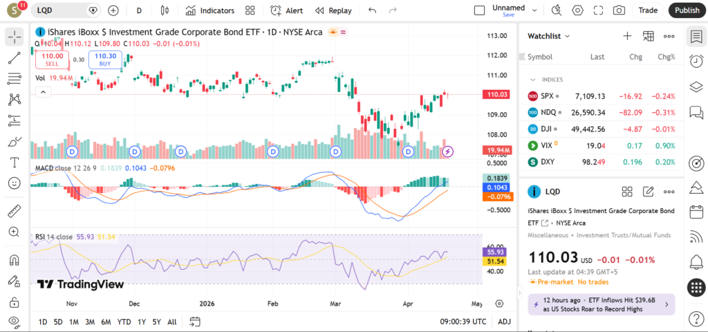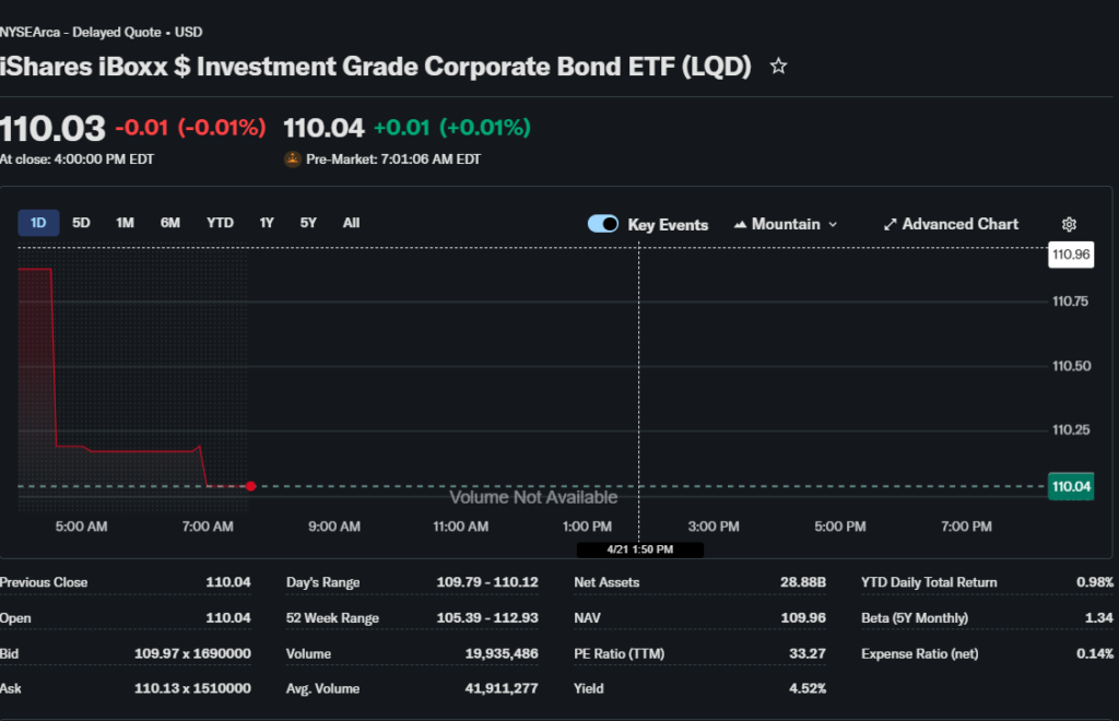 As of the latest market close, LQD ETF price is approximately $108.60.