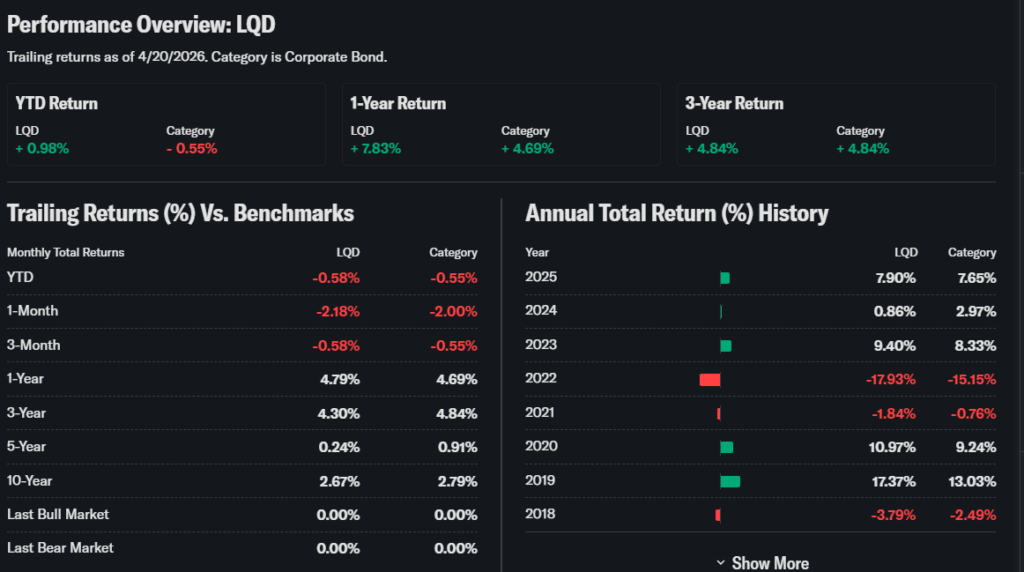 LQD ETF remains a core holding for income and stability.