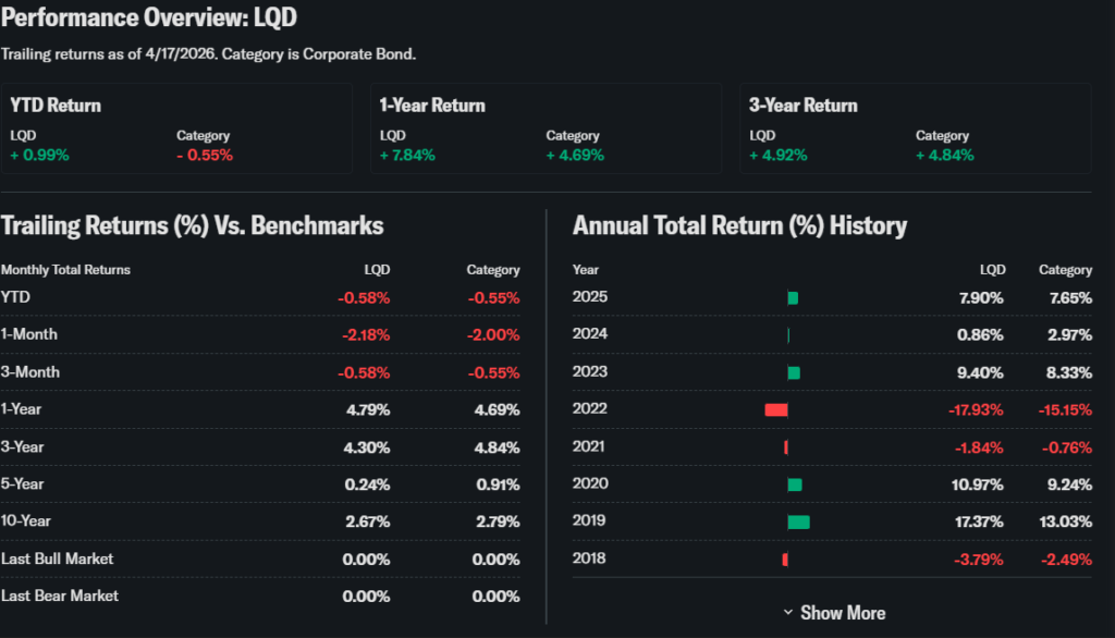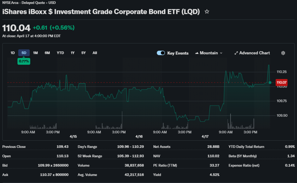 Investors focus on LQD ETF during uncertain market conditions because it offers relatively stable income compared to stocks. It is widely used for portfolio diversification and risk reduction.