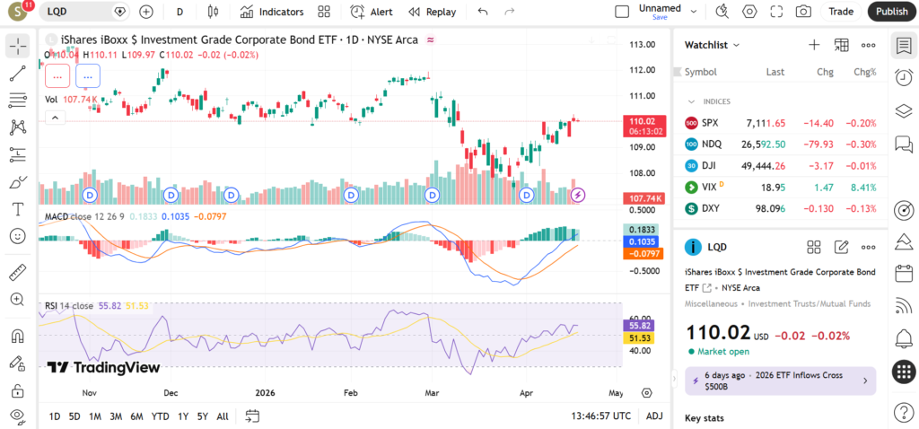 Over the past 5 days, LQD ETF has traded in a narrow range, reflecting low volatility. The 1-month trend is slightly positive, with gradual recovery.
