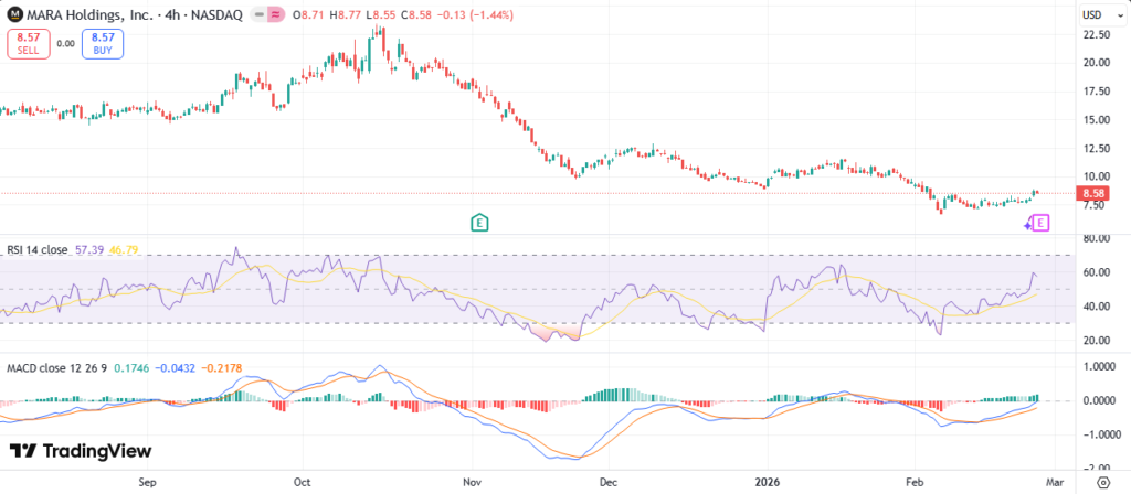 MARA stock closed at $8.55 on February 25, 2026, after trading between $8.11 and $8.84. It gained 5.4% from the day’s low. The 5-day trend shows a 12.08% rise with average volume of 29 million shares. Over one month, it fell 20.09%, signaling pullback.