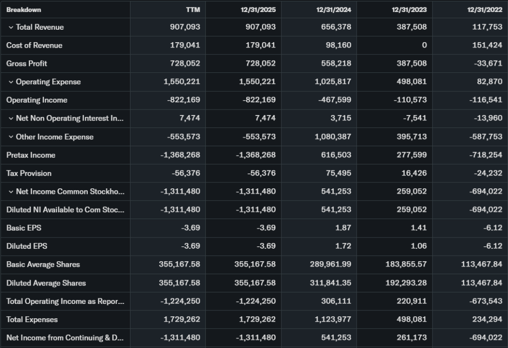 Q4 2025 revenue $202M, down YoY, full year up 38%. EPS -$4.52 missed badly, net loss $1.7B from fair value changes. Guidance not detailed, but focus on expansion.
