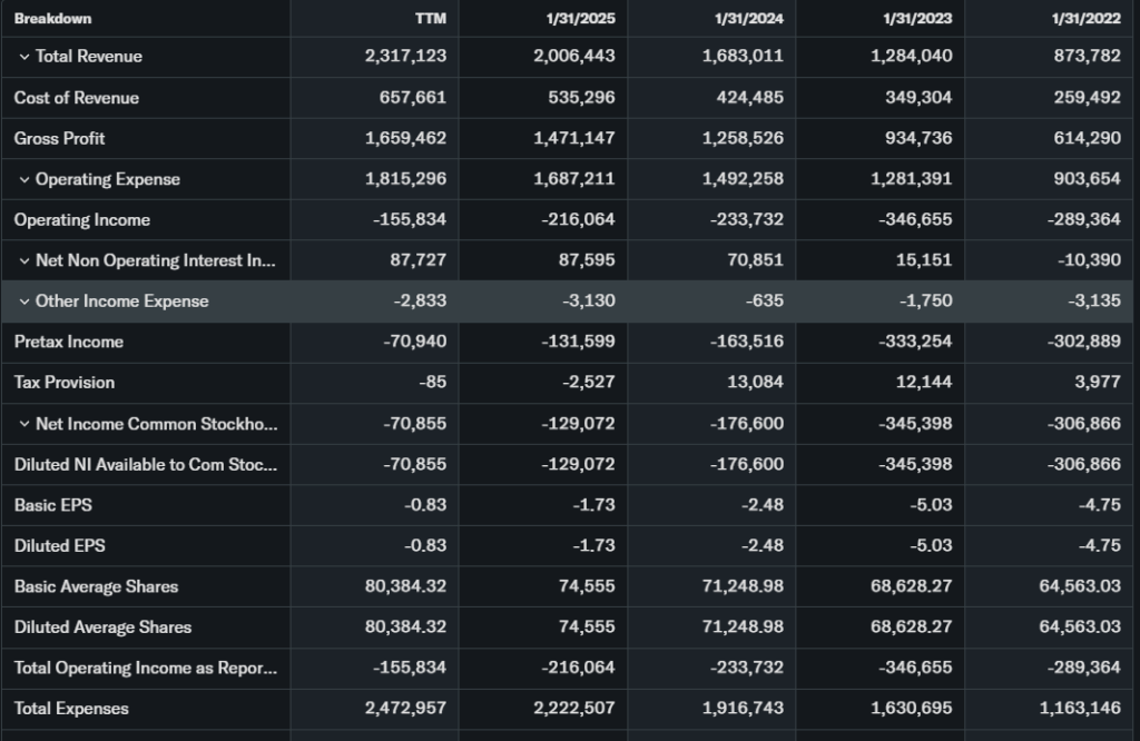 Trailing P/E stands at N/A due to past losses; forward P/E is 77.5. Price-to-sales ratio is 10.3, above peers. Revenue grew 27% YoY to $695M in Q4 FY2026.