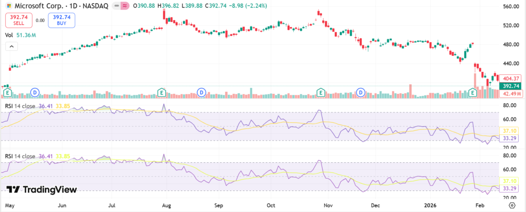 Volume hit 41.6 million shares, above average 32.6 million. Rising volume on down days warns sellers dominate. MSFT technical analysis points to caution. [code_file:MSFT_quotes_dc0f73.csv]