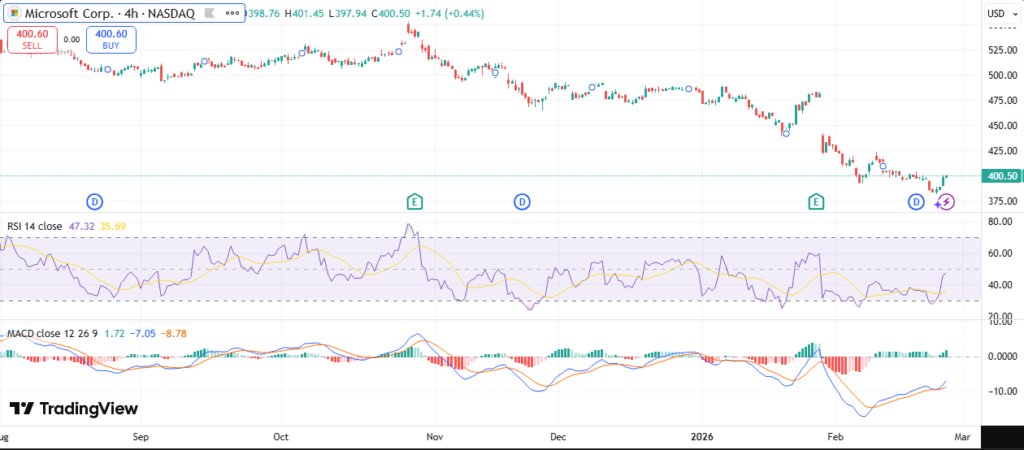 Over one month, the stock dropped amid broader tech pullback. Year-to-date, MSFT is down about 5% from early 2026 highs near $381.71. The six-month trend shows a 18-27% decline from July 2025 peaks.