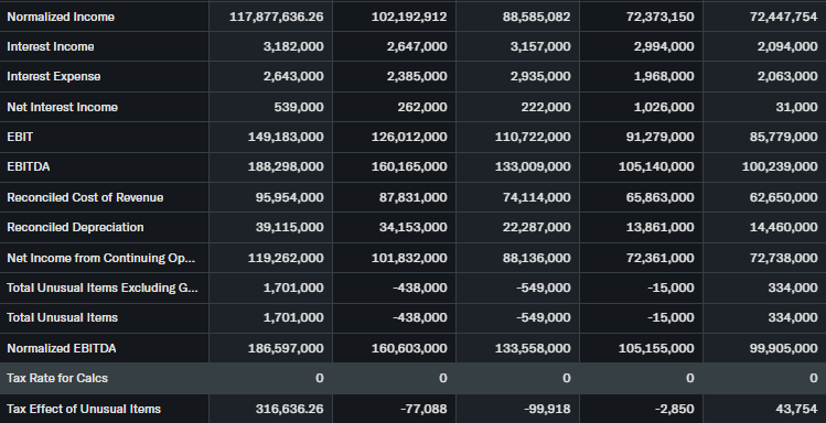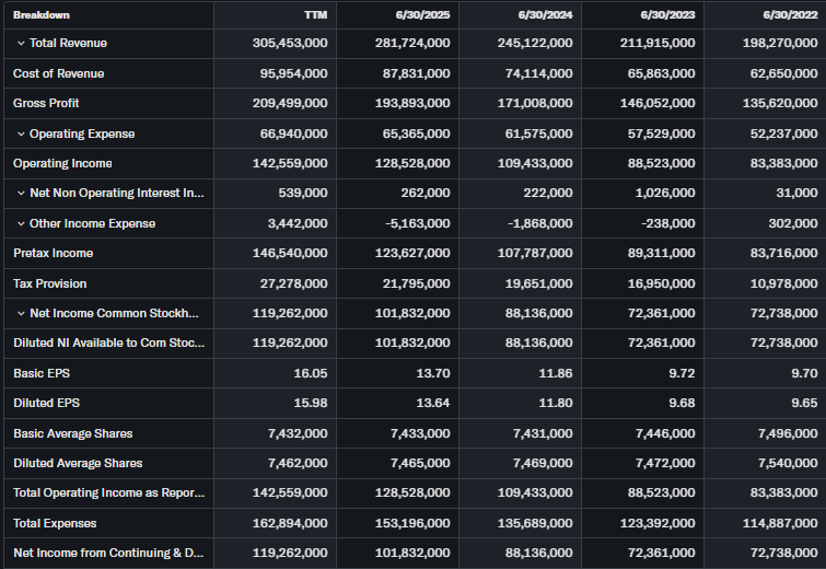 Revenue grew 13% YoY last quarter, EPS up 18%. EPS TTM $14.11. Strong free cash flow supports buybacks.