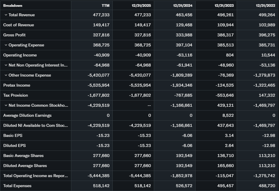 Trailing P/E negative -7.21x reflecting BTC impairment charges. Forward P/E N/A.