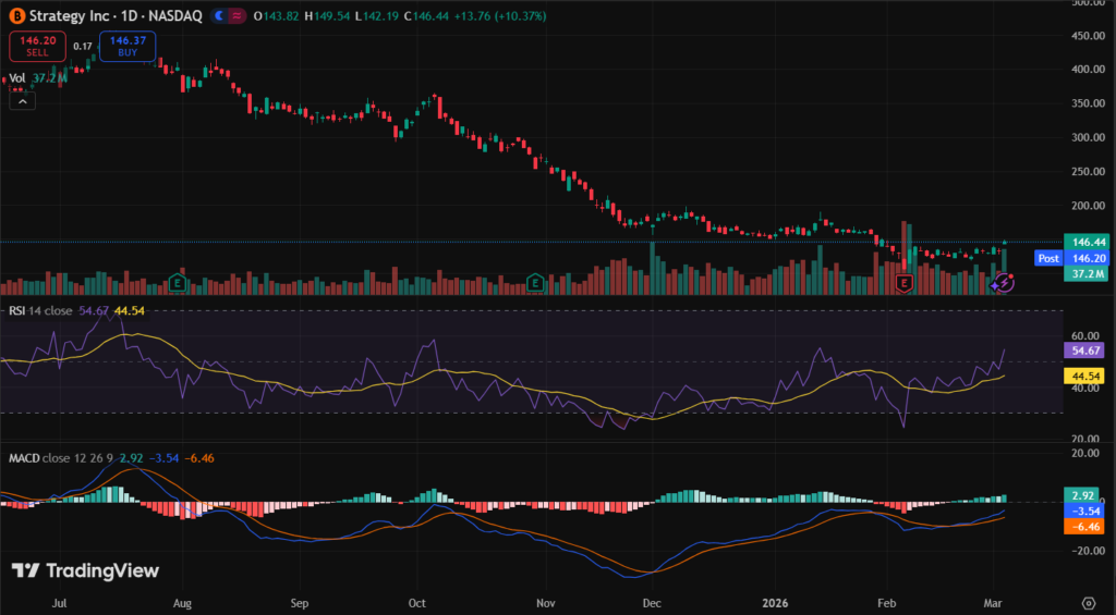 MSTR stock closed March 4, 2026 at $147.59 after 10.37% daily gain. Volume hit 15.6 million shares.