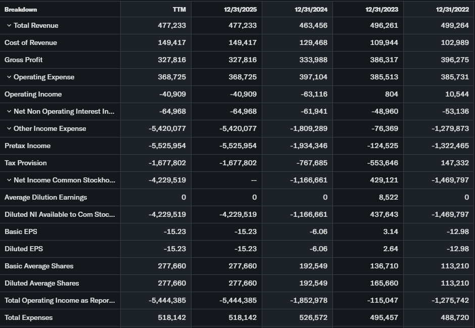 Bitcoin crashes wipe gains. Core BI business shrinking 5% yearly. Debt service spikes if rates rise.