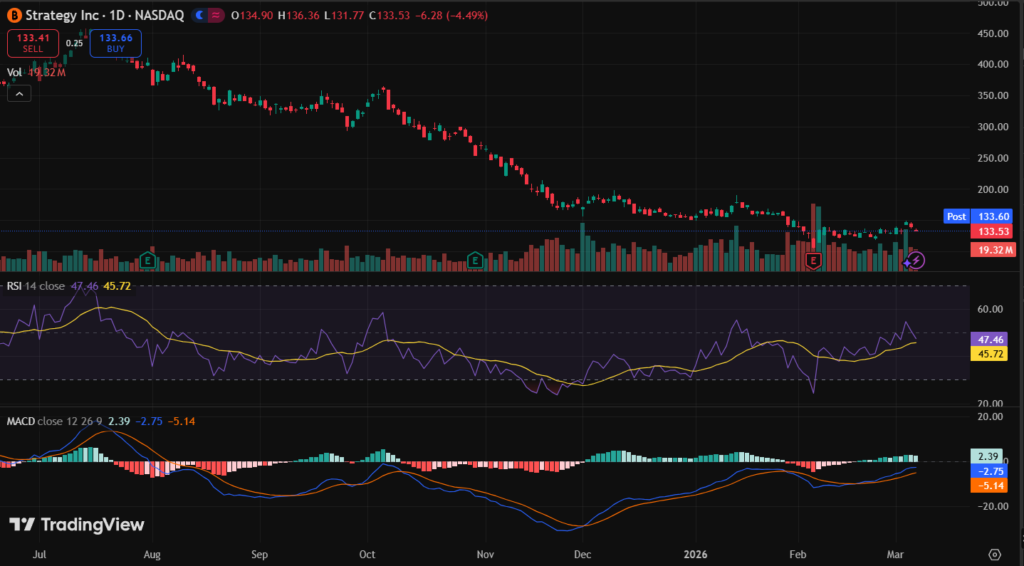 MSTR stock closed at $134.11 on March 6, 2026, last market session. It fluctuated between $132.59-$141.40 that day. Five-day trend dropped 5% from recent highs amid Bitcoin pullback.
