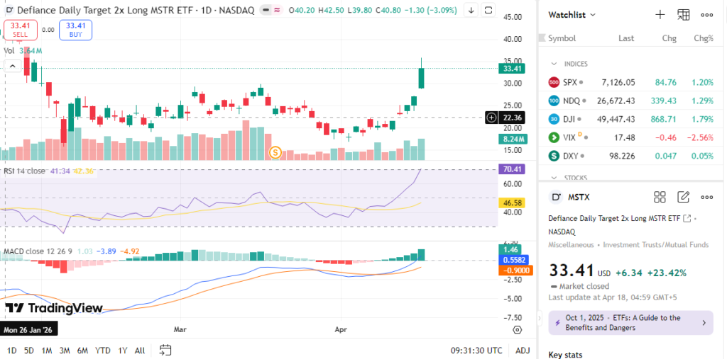 MSTX ETF closed at $33.32 on April 18, 2026.
