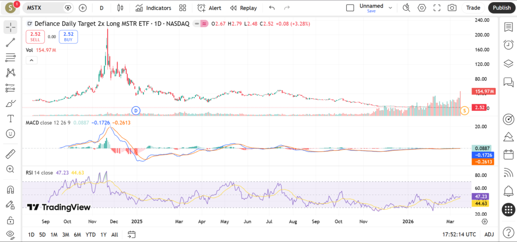 Taken together, MSTX’s technical picture in March 2026 is that of a leveraged ETF still in a broader downtrend but trying to stabilize after a deep decline. Price sits well below long‑term moving averages, yet short‑term momentum indicators suggest that the most aggressive phase of selling may have passed for now, leaving room for range‑bound or mean‑reversion trades while traders wait for the next strong signal from MicroStrategy and Bitcoin.