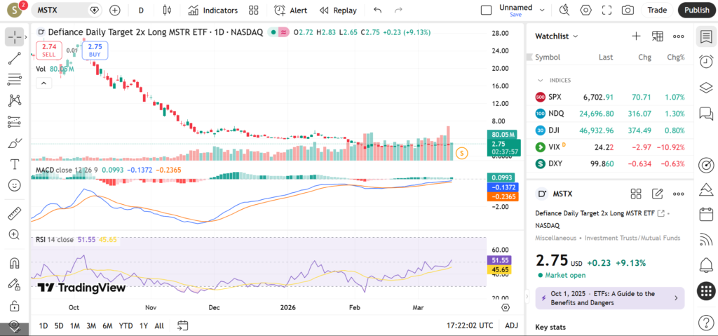 In March 2026, MSTX has become one of the most closely watched leveraged ETFs as crypto markets continue to influence related equities and funds. Rapid price swings in Bitcoin and crypto-linked companies frequently translate into sharp moves in MSTX. This article examines the ETF’s current technical trend, key support and resistance zones, and signals from RSI, MACD, and trading volume.