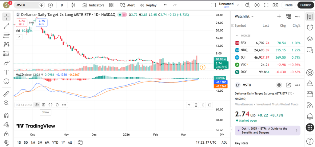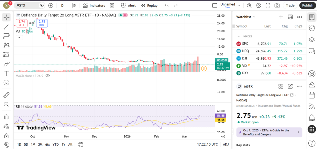 MSTX has been trading in a highly volatile pattern during March 2026, reflecting fluctuations in cryptocurrency sentiment. The ETF’s price action has shown sharp rallies followed by quick pullbacks, creating a wide trading range that technical traders often monitor for breakout opportunities.