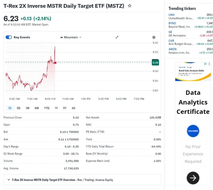 The MSTZ ETF, known as the T-REX 2X Inverse MSTR Daily Target ETF, is a leveraged inverse ETF designed to deliver -2x the daily performance of MicroStrategy (MSTR) stock.