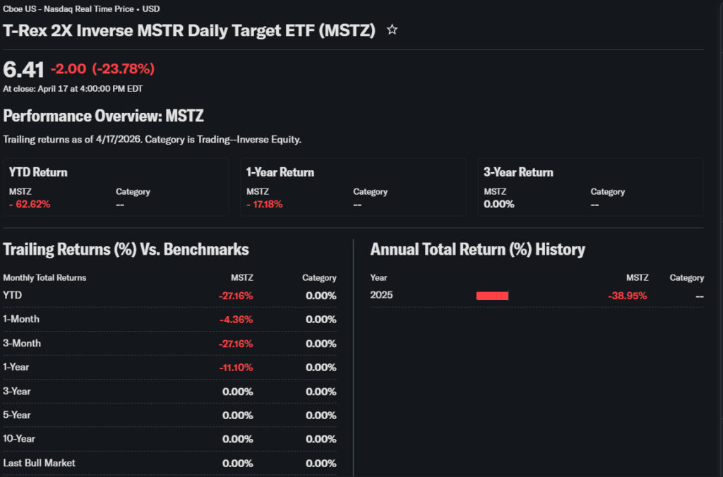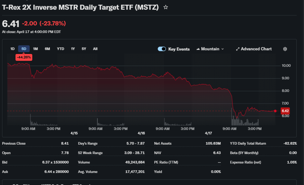 As of April 20, 2026, the MSTZ ETF price is around 6.42 USD, with wide intraday swings reflecting its targeted leveraged structure. From the prior close of about 9.10 USD, that implies a sharp 1‑day drop of roughly 23–30%, showing how quickly the MSTZ ETF can move after a large MSTR move.