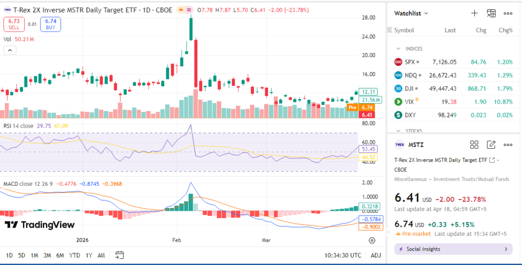 Institutional participation is visible in the high daily volume, while retail investors often treat MSTZ ETF as a way to double‑down on views about Bitcoin or MSTR over very short periods. Overall, the market sentiment leans speculative and momentum‑oriented, with many traders focused on technical signals rather than long‑term valuation.