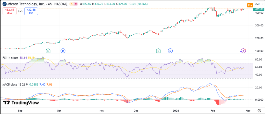 MU stock closed at $430.00 on February 25, 2026, after trading between $422.40 and recent highs. The 1-day gain hit 3.2% to $431.59 early, building on momentum.