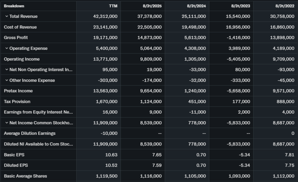 Q1 FY2026 (ended Nov 2025) showed EPS $7.65 full year 2025, up 992% from 2024. Quarterly Aug 2025 EPS $2.86, beat estimates.