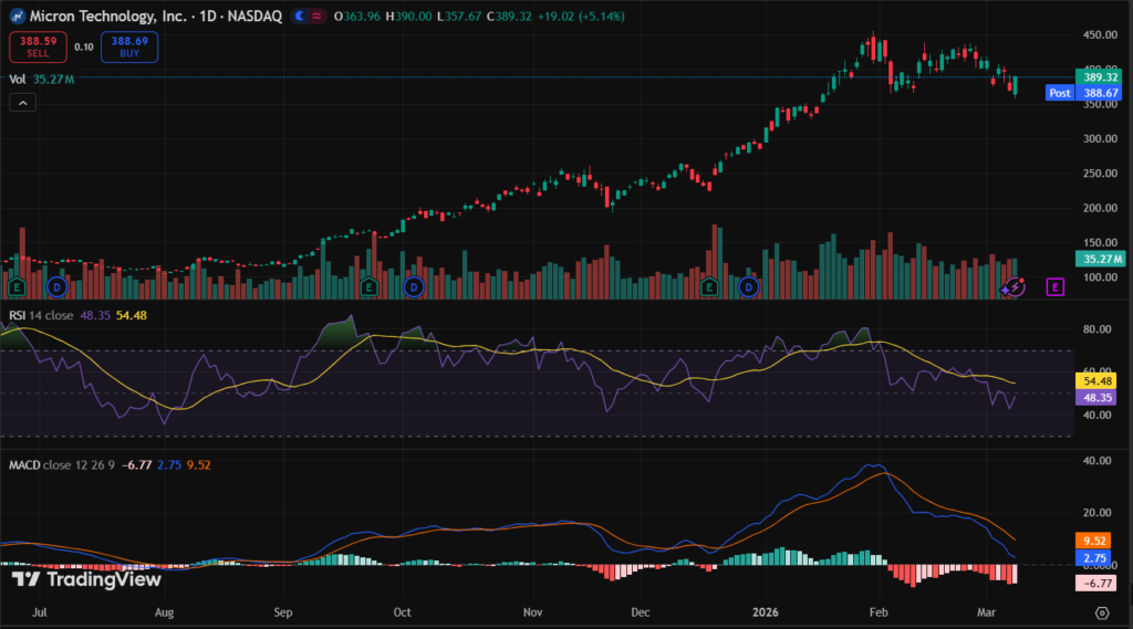 MU stock closed at $370.30 on March 6, 2026, per last market session data. It fell 6.74% that day, ranging $367.45-$391.18 with 34.5 million shares volume.